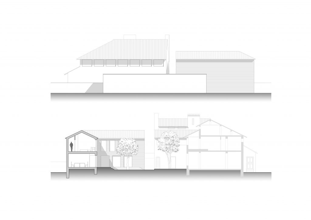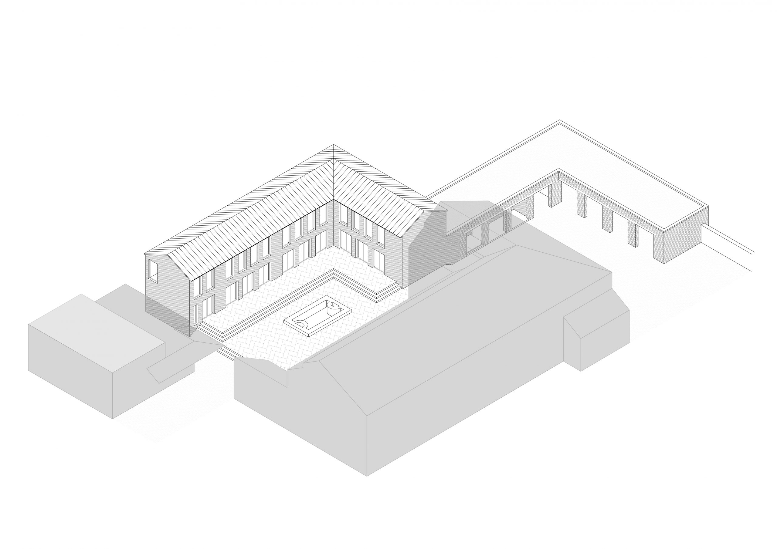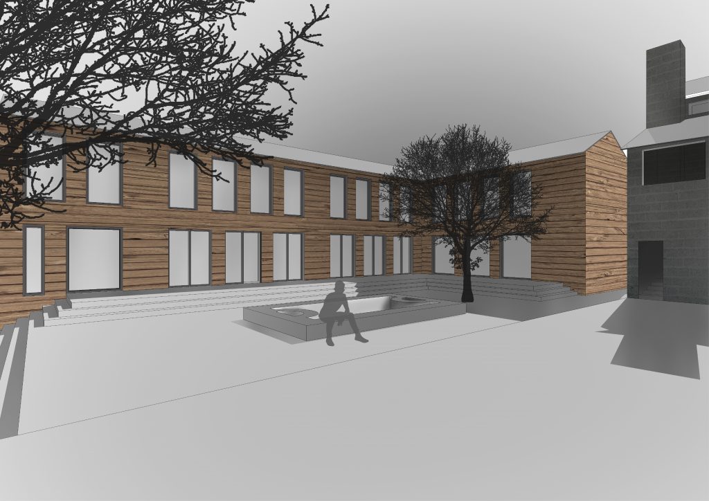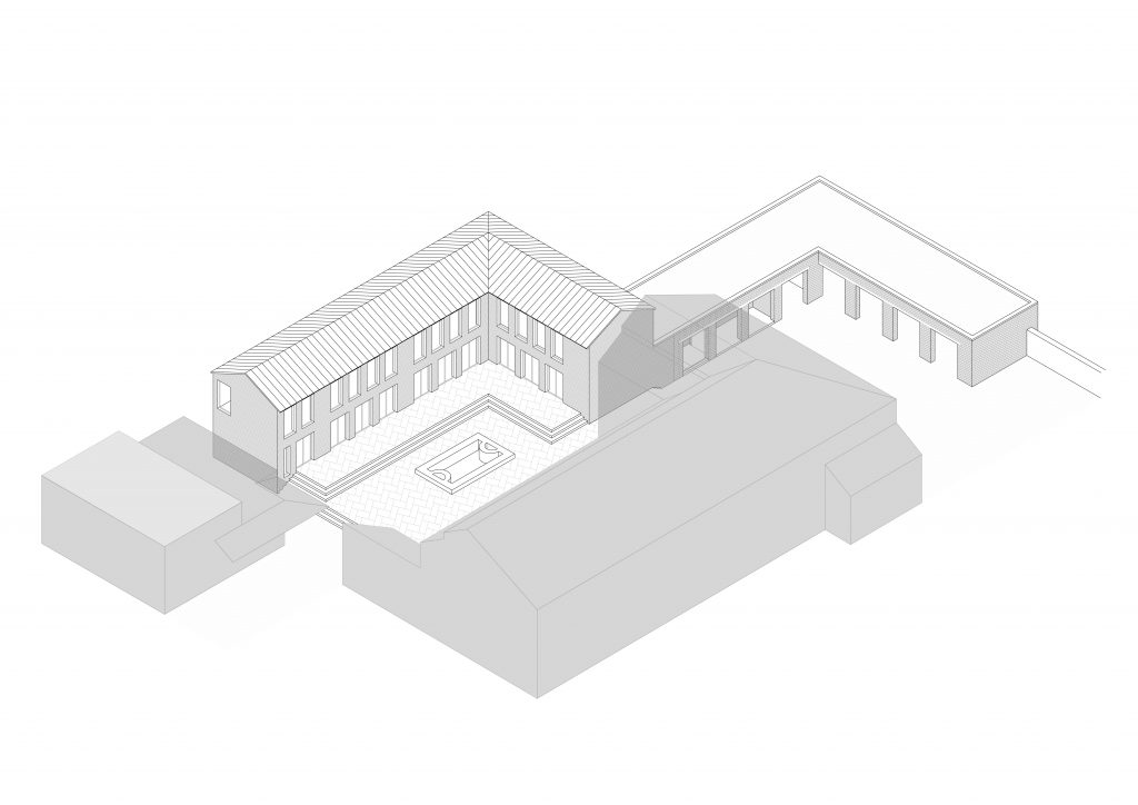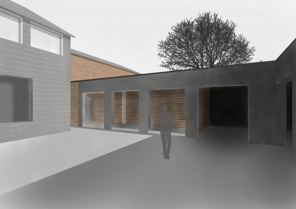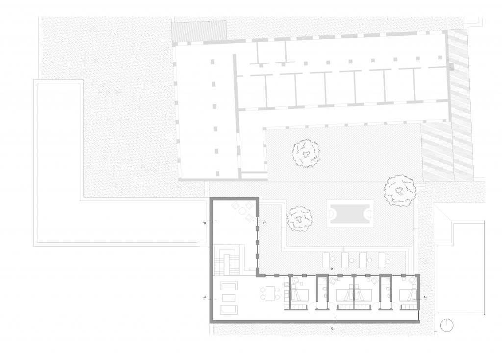 At the back of the residential building is an atrium, which until now has only been enclosed by the residential building itself. Adjacent to it is a sheep pasture. The guest house I planned, a retreat for programmers, is located at the northern end of this pasture, extends to the chapel and encloses a new courtyard between the residential house and the guest house.