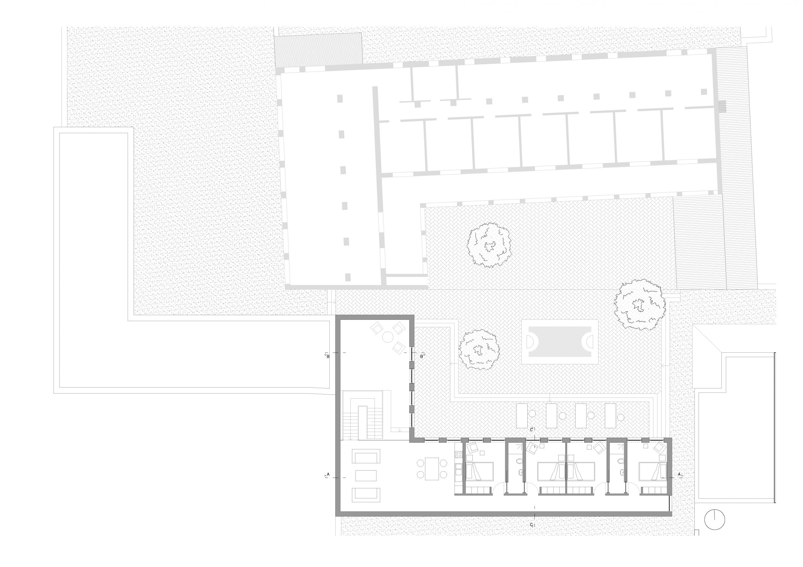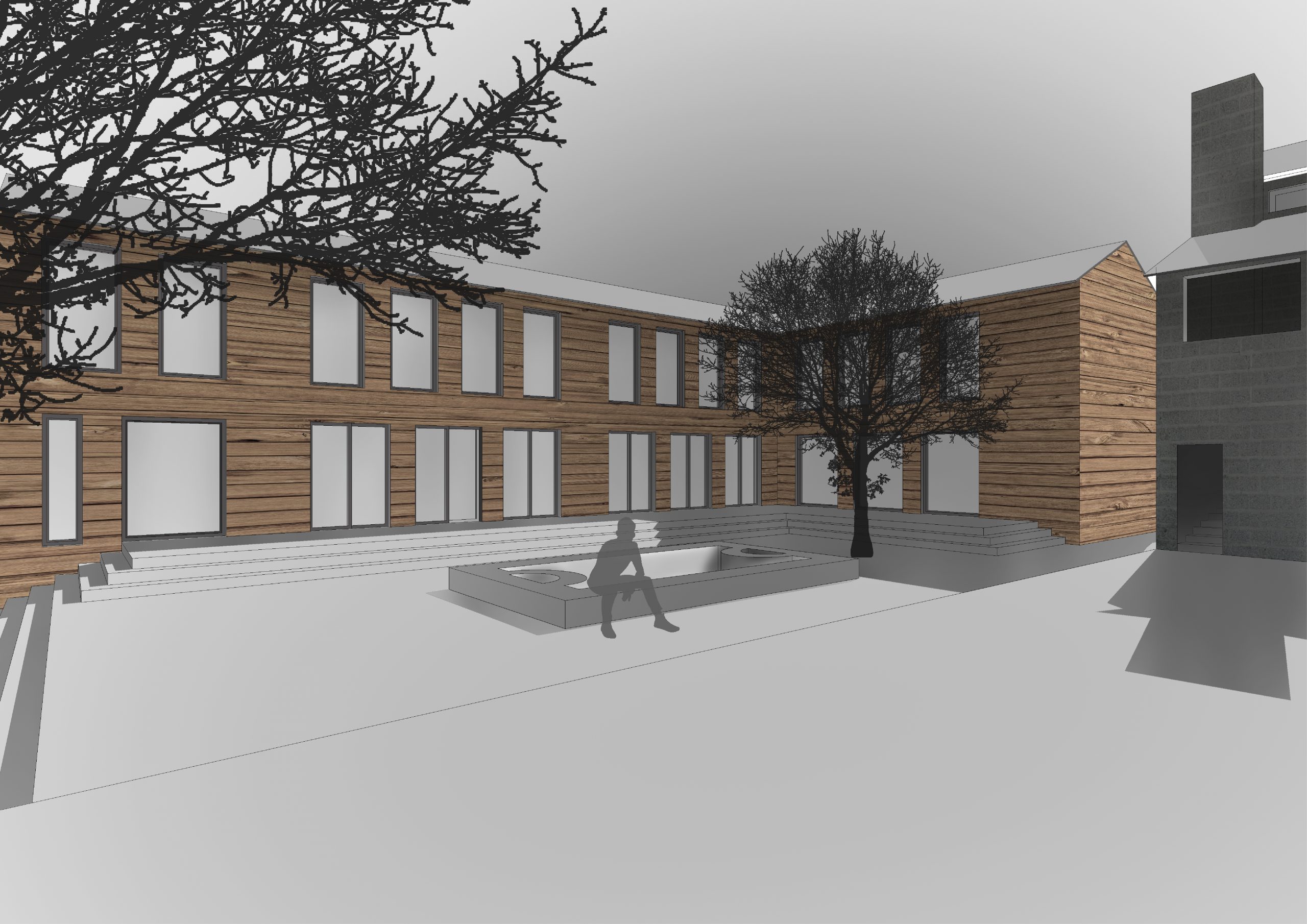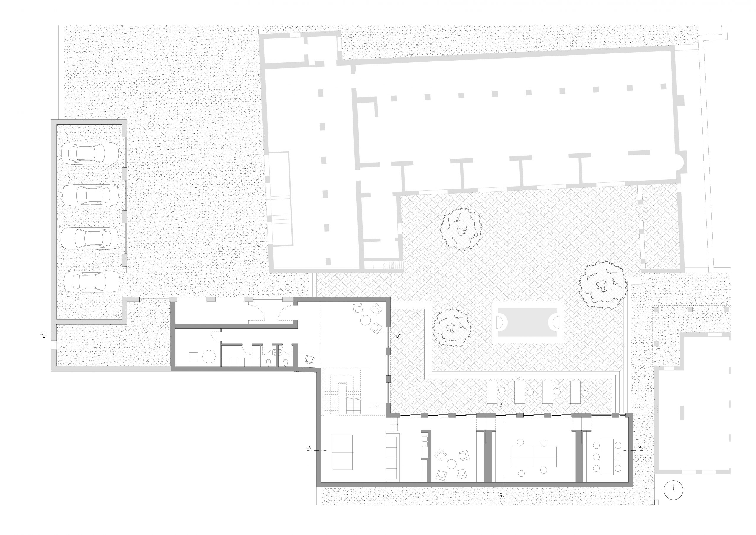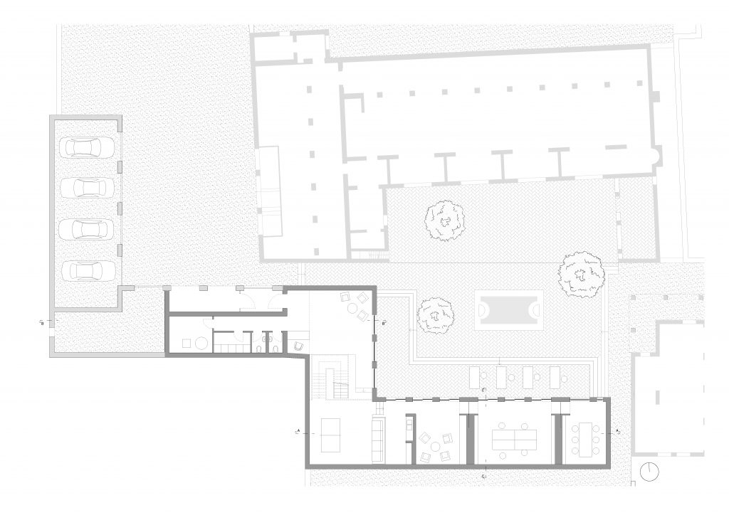 The atrium now takes on a courtyard quality and becomes an outdoor lounge area. Here the programmers can work outdoors or come to rest. It can also serve as an outdoor area for the original residential building.