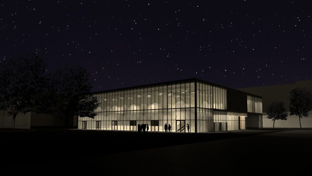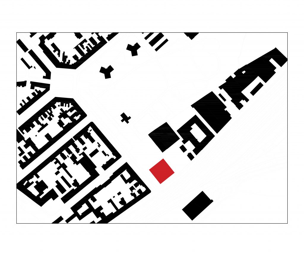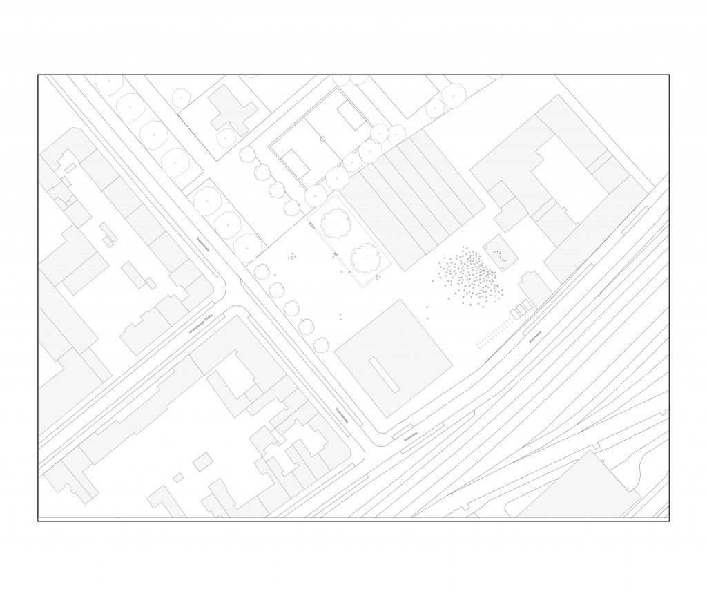 The square design is set on the opposite corner as a counterpart to the existing hall. It opens to both sides of the site with an elongated foyer. The northwest square serves as an extension of the adjacent park. The other open space can be used for outdoor concerts, flea markets and other activities. The central space is directly connected to the foyer and has a gallery on the upper floor. A two-story bar with the adjoining rooms on the southwest side serves to reduce noise for the residential development.